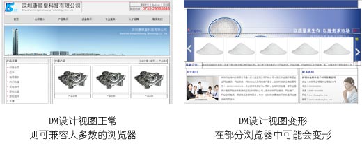 可能大家聽說過這樣的一句話:淹死的都是自認(rèn)為很會(huì)游泳的人。這估計(jì)是他們太高估自己的能力去冒險(xiǎn)了吧。作為網(wǎng)站設(shè)計(jì)師的我們是不是也不應(yīng)該高估自己的能力呢?為什么我們初學(xué)DIV+CSS的時(shí)候做出來的頁面總是那么的工整而不會(huì)錯(cuò)亂呢?反而到了實(shí)際工作應(yīng)用中卻錯(cuò)誤百出?如上圖所示,在Dreamweaver的設(shè)計(jì)模式下,網(wǎng)頁布局沒有變形基本上就沒有問題,而大多數(shù)的情況下,你自己的作品是不是會(huì)像右邊那樣變形而到了最新版的瀏覽器中卻顯示正常呢?創(chuàng)絡(luò)認(rèn)為,這其實(shí)跟游泳的人的心理是一樣的:認(rèn)為自己很厲害而忽略了很多細(xì)節(jié)。有的網(wǎng)站設(shè)計(jì)公司可能會(huì)要求最高效率的實(shí)現(xiàn)網(wǎng)站的重構(gòu),而創(chuàng)絡(luò)卻不是非常認(rèn)同這個(gè)觀點(diǎn),我們對(duì)公司內(nèi)部的設(shè)計(jì)師有一個(gè)最基本的要求:在保證代碼完整的情況下,用最簡潔的代碼實(shí)現(xiàn)預(yù)設(shè)的功能(如需了解詳情,歡迎致電創(chuàng)絡(luò)了解)。